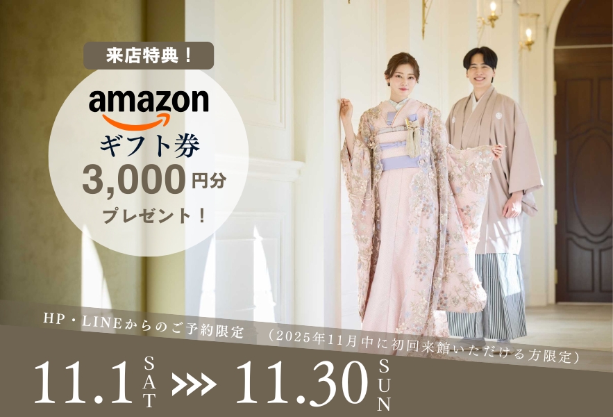 フォトウエディングや韓国フォトにご興味のある方へ、この秋だけの嬉しいキャンペーン。11月中にご相談会へ参加された方全員に、Amazonギフト券3,000円分をプレゼントいたします。大聖堂での憧れの一枚や、ガーデンでの自然なショット、韓国フォトならではの洗練された仕上がりまで、おふたりの理想に合わせた撮影をご提案。実際に会場やスタジオをご見学いただきながら、撮影のイメージをふくらませていただけます。ぜひこの機会にお気軽にご来館ください。